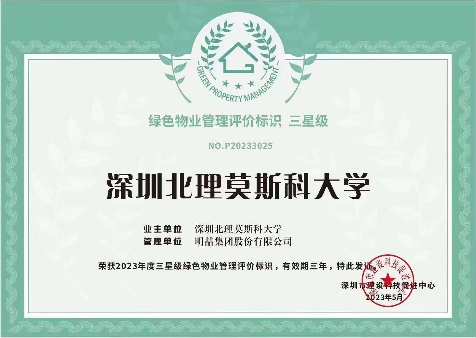 日前,深圳北理莫斯科大学项目荣获“绿色物业管理评价标识”三星级奖牌。这是深圳首个学校类项目获得此等级标识,明喆集团首次申请通过审核及认证。
