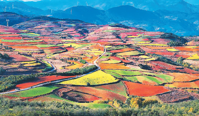 冬日艳阳下,云南省昆明市东川区红土地镇独特的红土地景观,吸引各地游客前来,也带动周围百姓增收。张驰、叶志刚摄