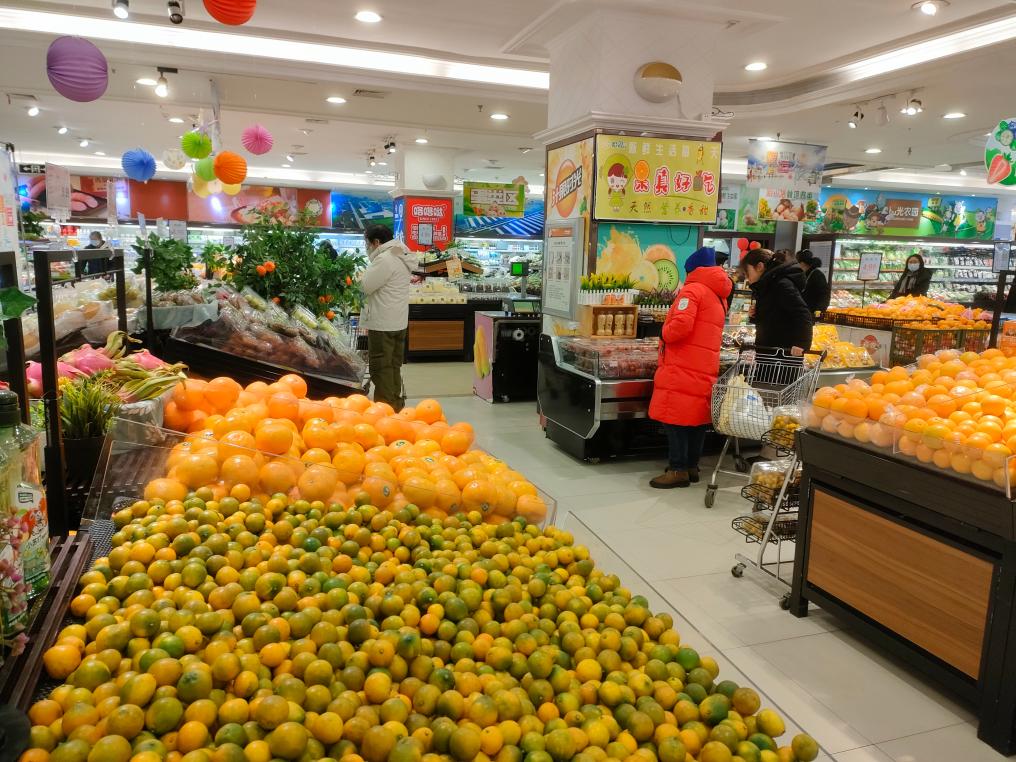 图为哈尔滨哈尔信超市内,蔬菜、水果供应充足。新华社记者朱悦 摄