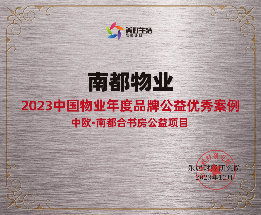 12月12日,由乐居财经主办,中国房地产业协会、全国工商联家具装饰业商会共同指导,新浪财经、中国企业家、中房网联合主办的2023(第七届)中国地产经理人评选荣誉发布会举行。南都物业的“中欧-南都合书房公益项目”荣获“2023中国物业年度品牌公益优秀案例”。