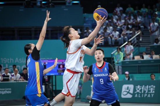 ??10月1日,中国队球员王馨雨(中)在杭州亚运会三人篮球项目女子U23金牌决赛中上篮。新华社记者 潘昱龙 摄
