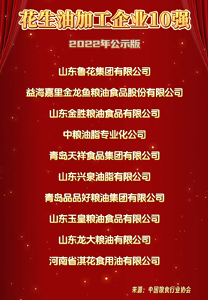 中国粮食行业协会2023年重点粮油企业专项调查结果显示:山东鲁花集团公司为花生油加工企业首强、食用油加工企业前3强。