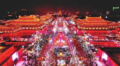 大雁塔下,大唐不夜城景区朱墙金顶,灯火辉煌,人流奔涌。体验唐代市井生活的长安十二时辰主题街区、感受唐诗魅力的星光步道、呈现艺术之美的音乐厅和大剧院,诸多文化场馆和场景散落于这条2公里长的仿唐街道上,各美其美,相得益彰。