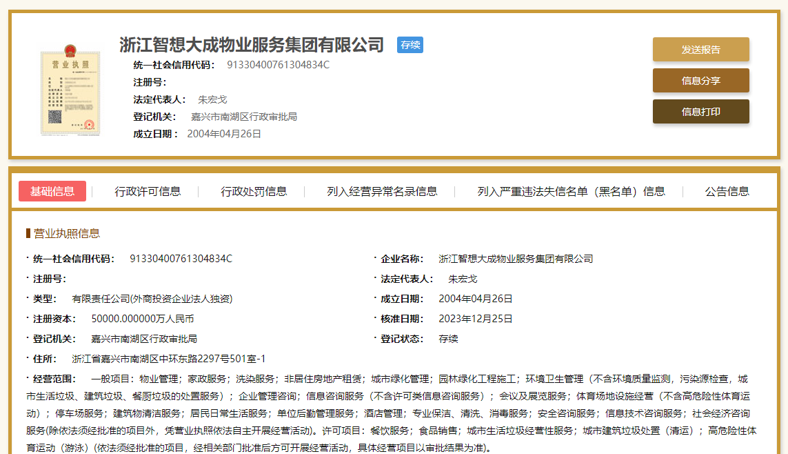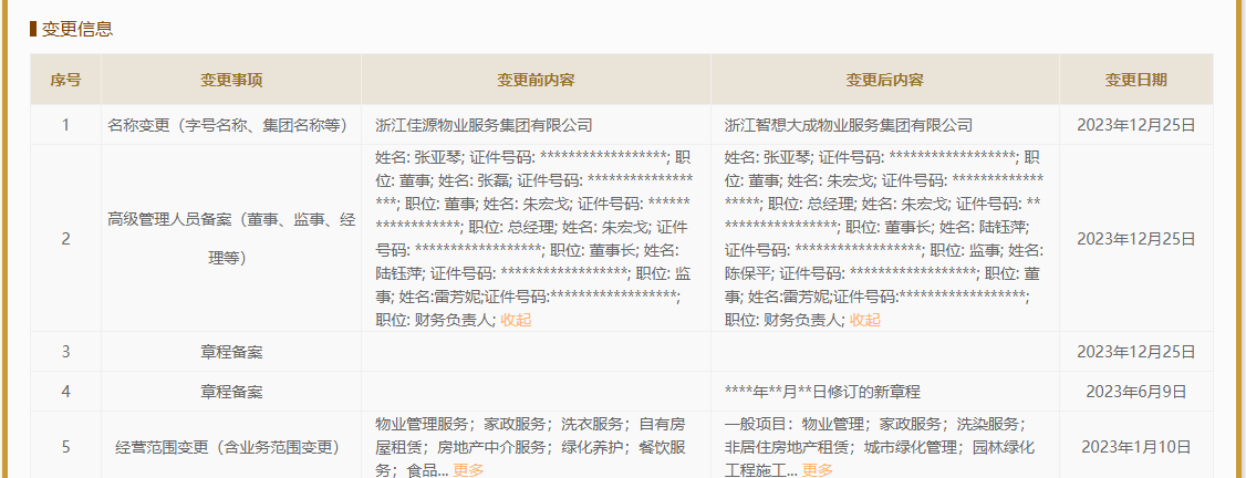 据查,智想大成物业成立于2004年4月26日,注册资本5亿元,法人代表为朱宏戈。目前,其由浙江禾源物业服务有限公司100%持股,由佳源物业管理有限公司间接100%持股。