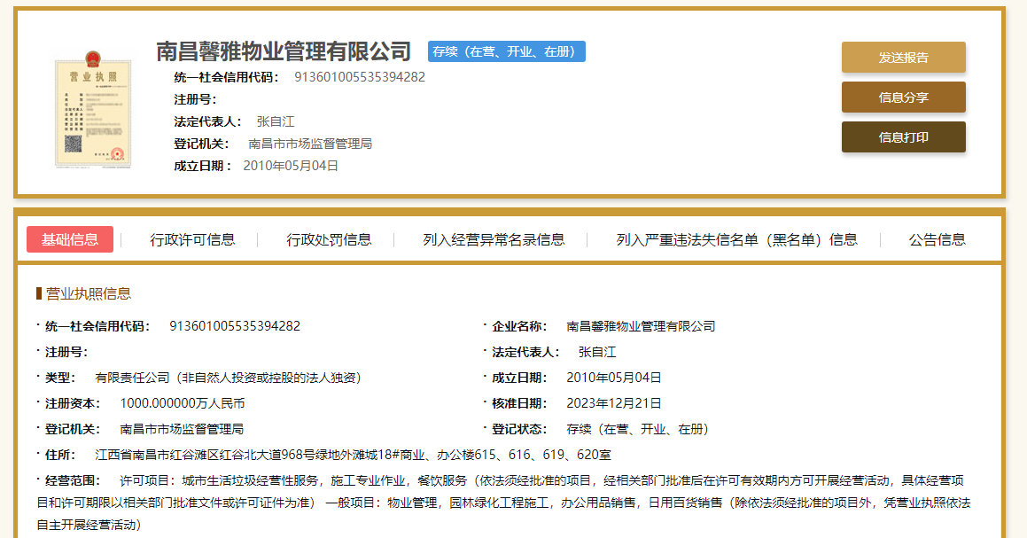 据查,馨雅物业成立于2010年,注册资本为1000万元,法定代表人为张自江,经营范围含城市生活垃圾经营性服务,施工专业作业,餐饮服务等。