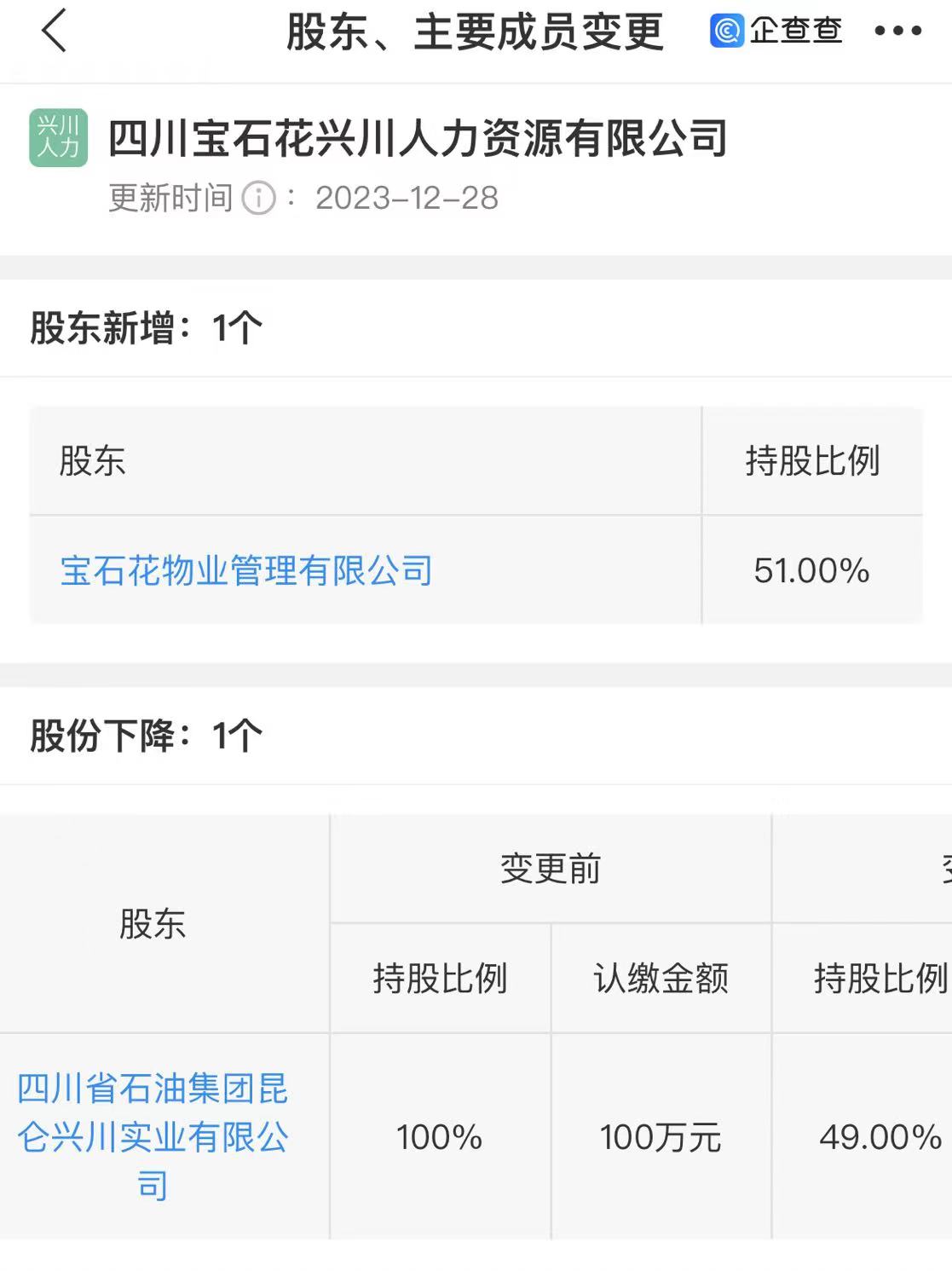乐居财经 吴文婷12月29日,四川省石油集团昆仑兴川实业有限公司(以下简称“昆仑兴川实业”)转让四川宝石花兴川人力资源有限公司(以下简称“宝石花兴川人力资源”)51%股权,宝石花物业管理有限公司(以下简称“宝石花物业”)接盘。