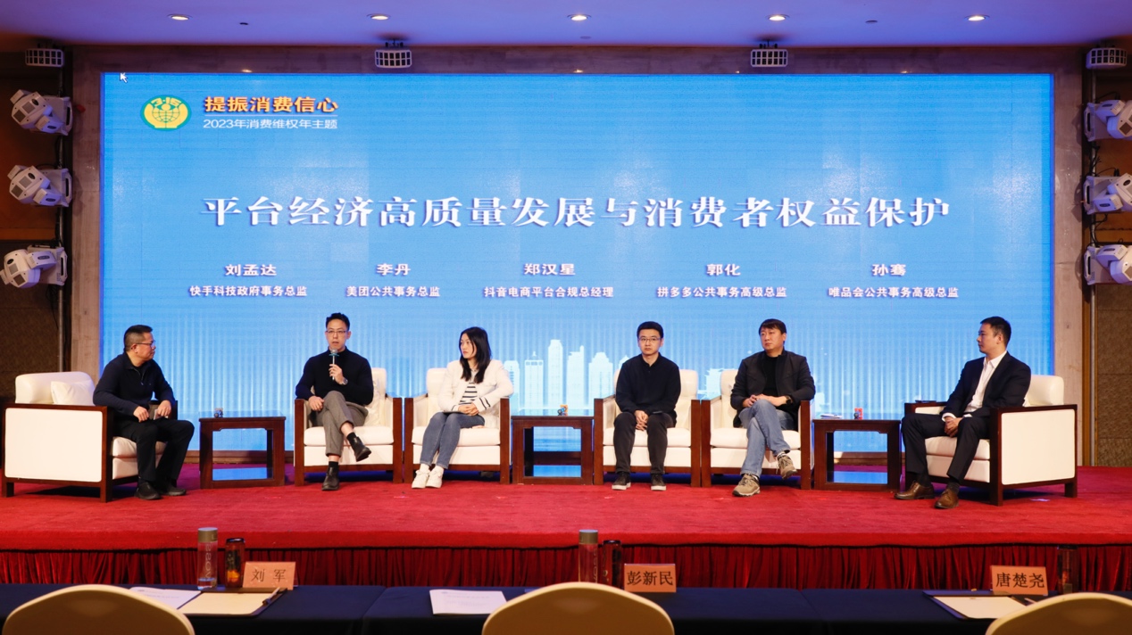 (从左到右:杭州市消保委秘书长陈兆波、北京快手科技有限公司政府事务总监刘孟达、美团公共事务总监李丹、抖音集团抖音电商平台合规总经理郑汉星、拼多多公共事务高级总监郭化、唯品会公共事务高级总监孙骞)